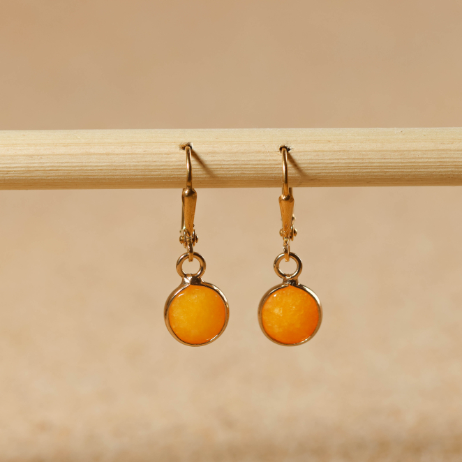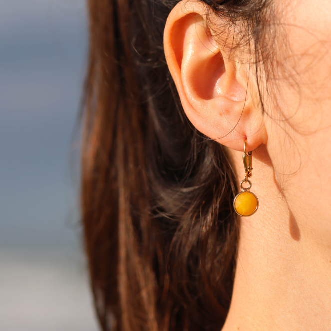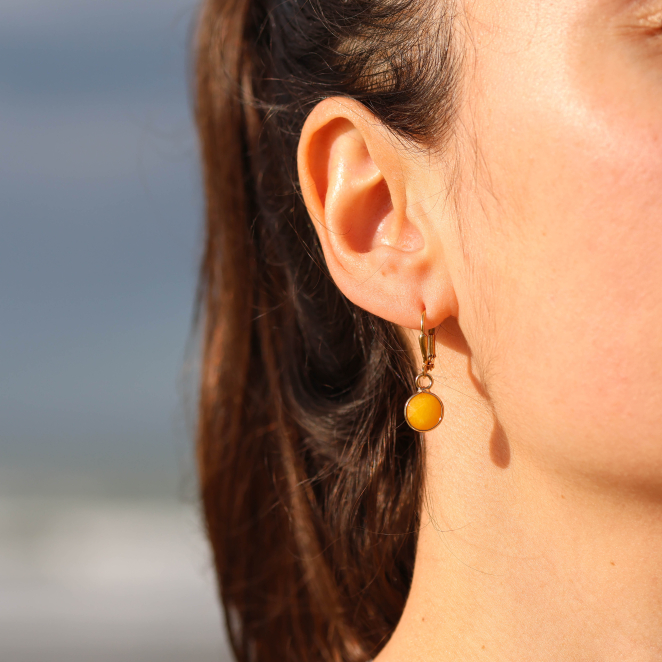 Découvrez nos petites boucles d'oreilles pour femme Bounie, un bijou doré à l'or fin 24K qui apporte une touche de lumière et de douceur à votre style. Ces dormeuses, ornées d'un pendentif rond en verre jaune, évoquent l'éclat du soleil sur les vagues et l'esprit nature de la côte Ouest. Parfaites pour sublimer vos tenues avec une note d'évasion et de simplicité, elles s'intègrent harmonieusement dans votre quotidien, comme un souvenir de bord de mer.