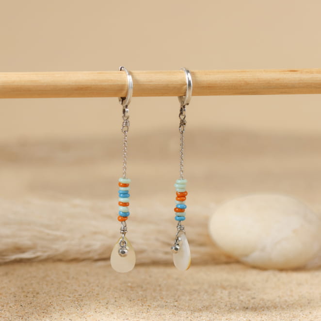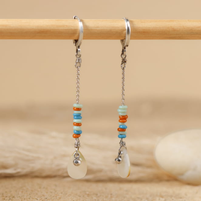 Faites vibrer votre style avec les boucles d'oreilles Cap, ces petites et légères boucles sont des bijoux en perles bleu ciel multicolore avec un pendentif en forme de goutte en nacre blanche et argent.