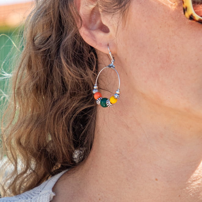 Les boucles d'oreilles Carmen accordent de magnifiques perles de couleurs en verre et métal argenté qui viennent ajouter de l'éclat à votre visage.
