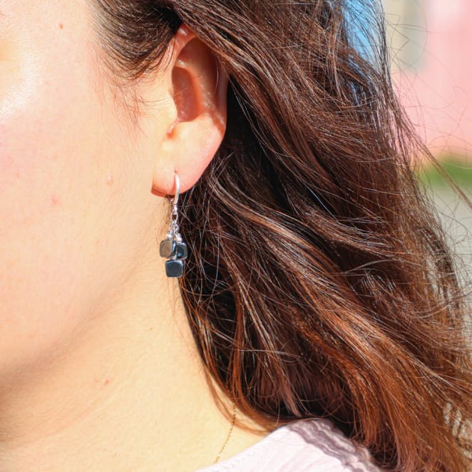 Sublimez votre visage avec les boucles d'oreilles Carreau. Elles révèlent leur élégance discrète par leurs reflets minéraux et leur design épuré. Ces boucles légères, composées de dormeuses rondes et de perles en hématite grises, s’associent à des chaînes argentées un rendu à la fois sobre et lumineux. Faciles à porter, elles apportent une touche de modernité à votre style.