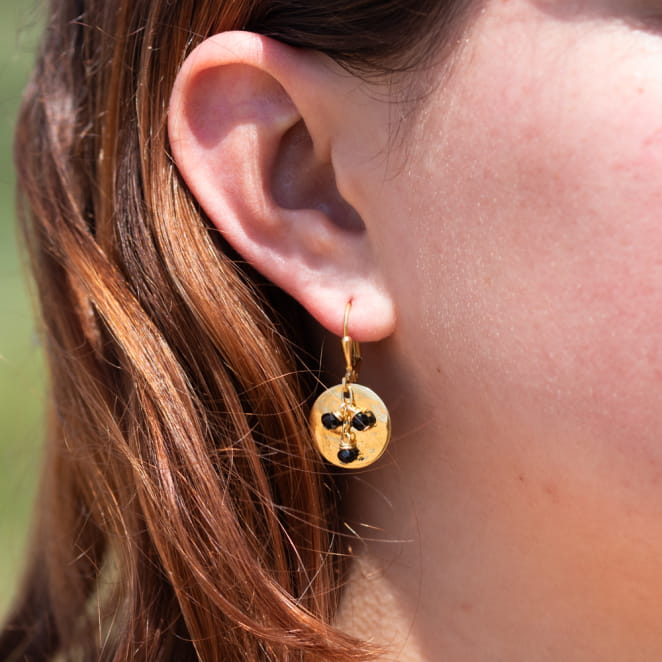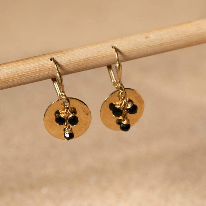 Explorez l'élégance éthique avec les boucles d'oreilles Chantal. Légères et simples, elles marient l'éclat doré à des perles en verre noir recyclées. Une union harmonieuse de style et de responsabilité, faisant de ces boucles un choix chic et conscient pour affirmer votre élégance.