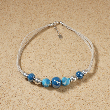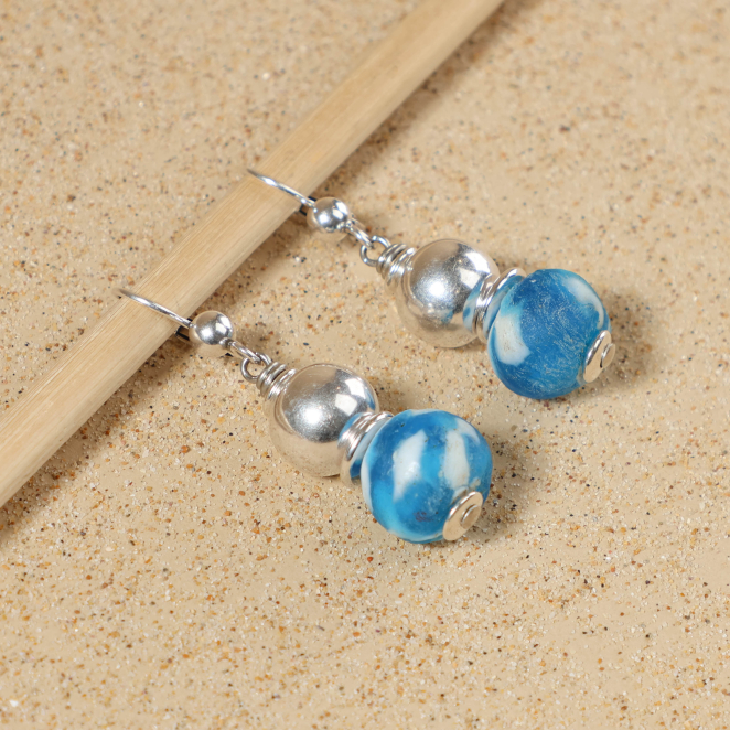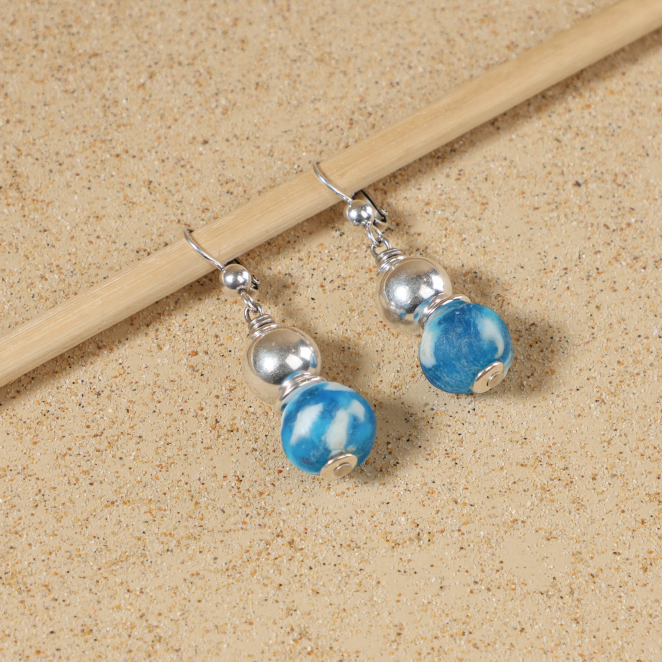 Adoptez l’élégance naturelle de nos boucles bleu, Chopa. Montées sur dormeuses, ces boucles d’oreilles mêlent une large perle argentée brillante et une perle en verre recyclé bleu, à la transparence douce. Une composition épurée et lumineuse, facile à porter, qui capte la lumière tout en restant délicate. Parfaites seules ou associées au collier coordonné.