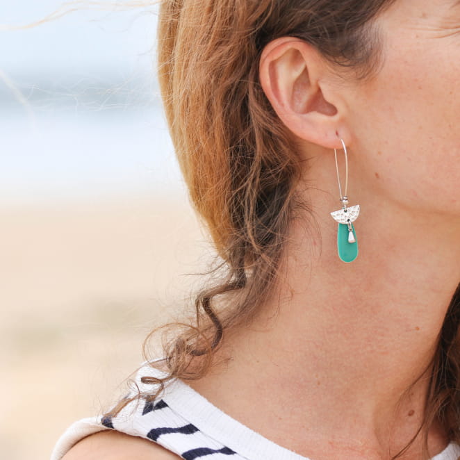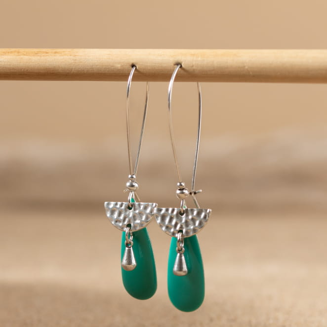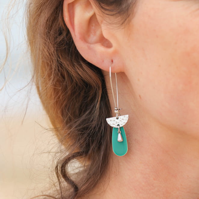 Les boucles d'oreilles pendantes Clin, aux douces teintes d'émeraude, capturent parfaitement l'essence de la nature. Avec leur design délicatement martelé et une élégante goutte verte, elles évoquent la fraîcheur des vagues caressant les rivages. Légères et aériennes, elles flottent gracieusement à chaque mouvement, reflétant subtilement la lumière comme les reflets du soleil sur l'eau. Un accessoire idéal pour les amoureuses de la simplicité, qui cherchent à apporter une touche de nature et d'authenticité à leurs tenues.