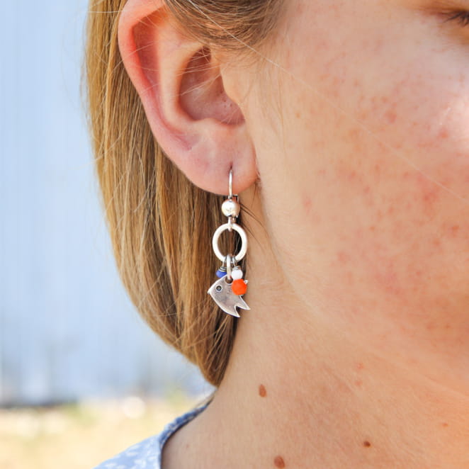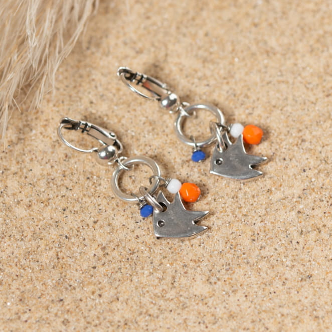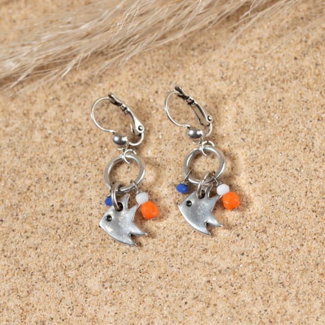 Les boucles d'oreilles Clown se composent de pendentifs poisson argentés ornés de perles orange, bleues et blanches. voir plus