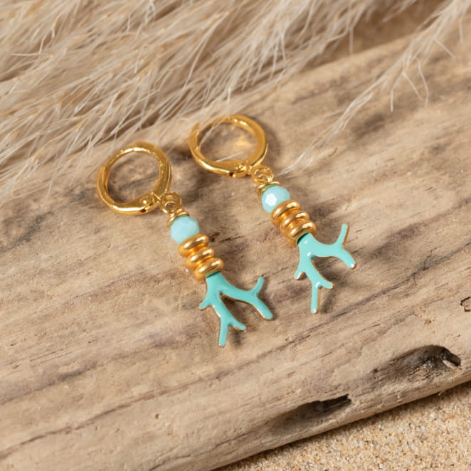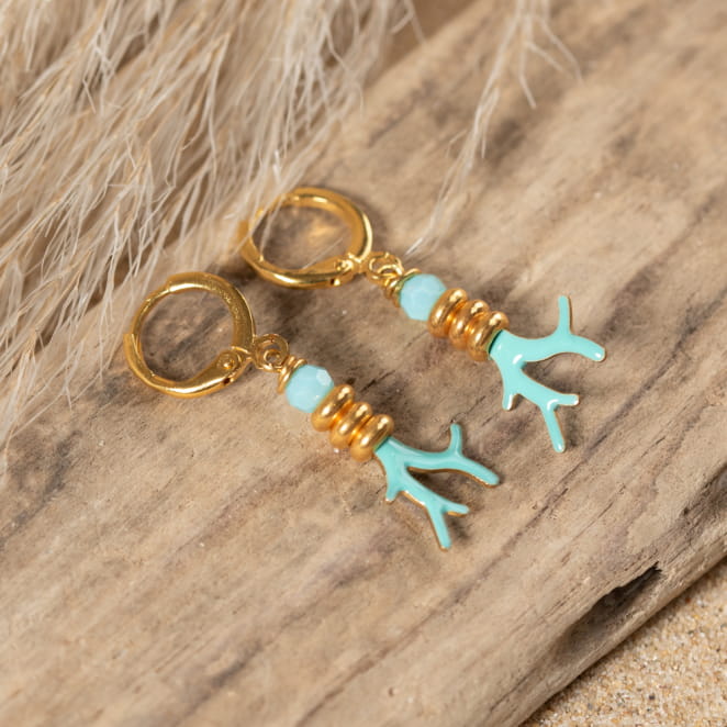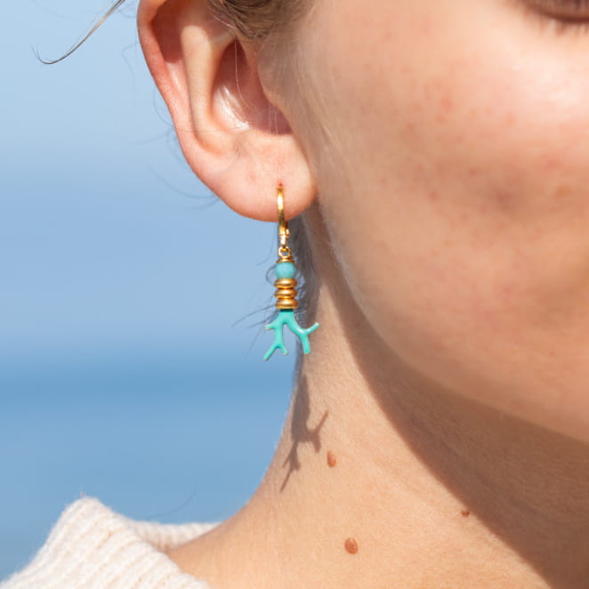 Découvrez l'exquise élégance des boucles d'oreilles Coraux. Sur des dormeuses dorées, ces petites pendantes arborent de charmants pendentifs en forme de coraux turquoise, accompagnés de perles en métal doré et d'une perle en verre bleu. Un mariage subtil de sophistication et de couleur pour rehausser votre style avec finesse. Optez pour ces bijoux raffinés pour une touche marine et élégante à vos tenues.