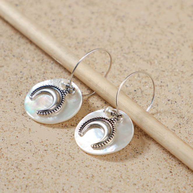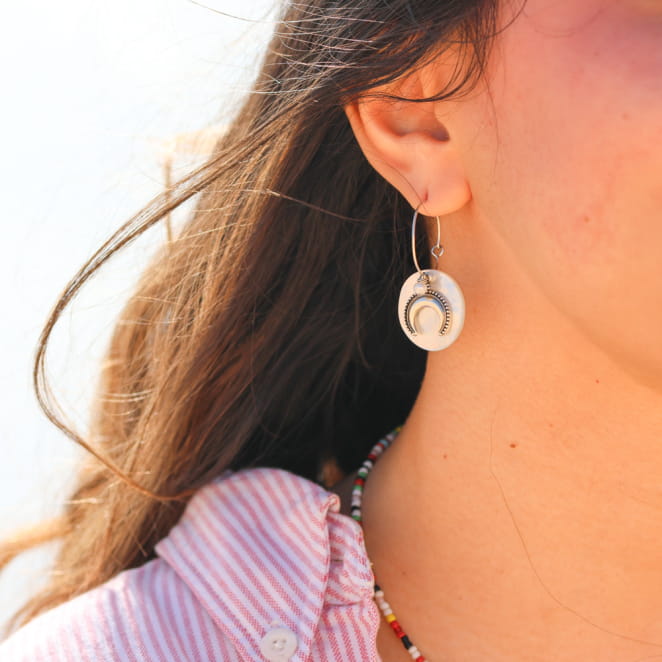 Découvrez les boucles d'oreilles Corne : un bijou argenté sophistiqué avec un pendentif rond en nacre blanche. voir plus