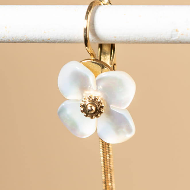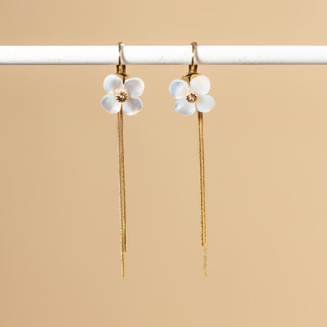 Découvrez les boucles d'oreilles Cyclamen, des pendantes élégantes qui ajoutent une touche florale à votre style .Ornées d'une perle en nacre blanche en forme de fleur, elles évoquent la délicatesse printanière. Les chaînes dorées tombantes rappellent la tige de la fleur, ajoutant une touche de douceur et d'élégance à votre tenue.
