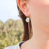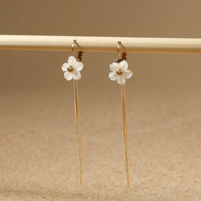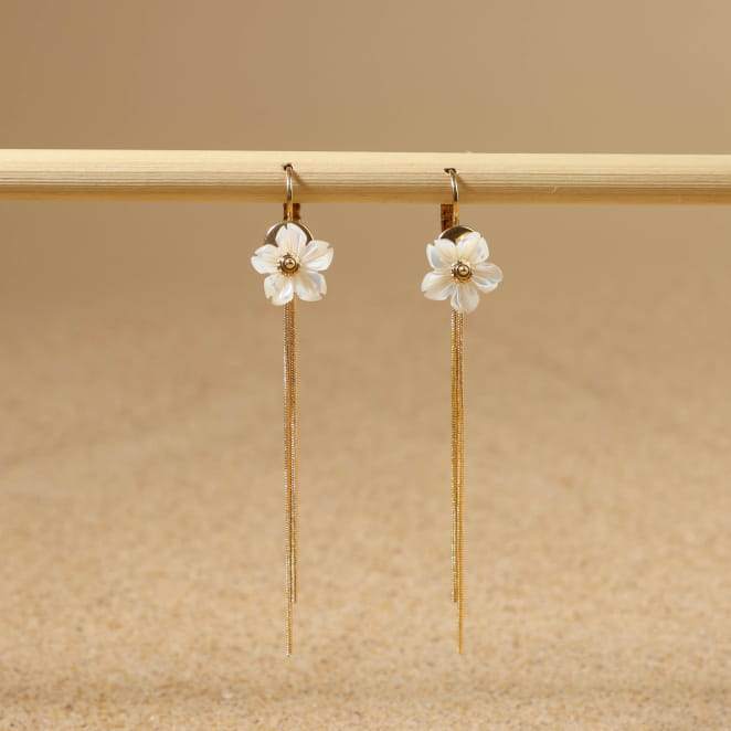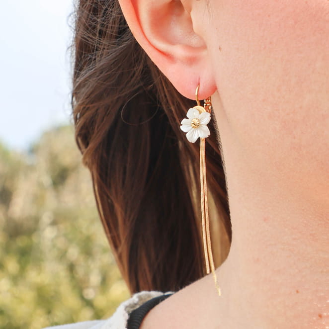 Découvrez les boucles d'oreilles Cyclamen, des pendantes élégantes qui ajoutent une touche florale à votre style .Ornées d'une perle en nacre blanche en forme de fleur, elles évoquent la délicatesse printanière. Les chaînes dorées tombantes rappellent la tige de la fleur, ajoutant une touche de douceur et d'élégance à votre tenue.