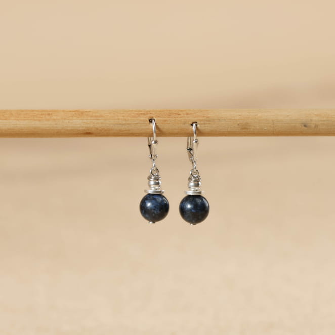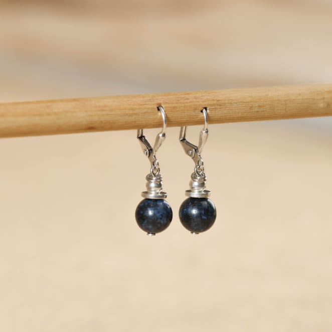 Adoptez les délicates boucles d'oreilles Dario ! Ces jolies pendantes arborent des perles de dumortiérite d'une couleur bleu unique. L'alliance de ces dernières avec son montage en métal argenté en font un bijou unique en son genre.