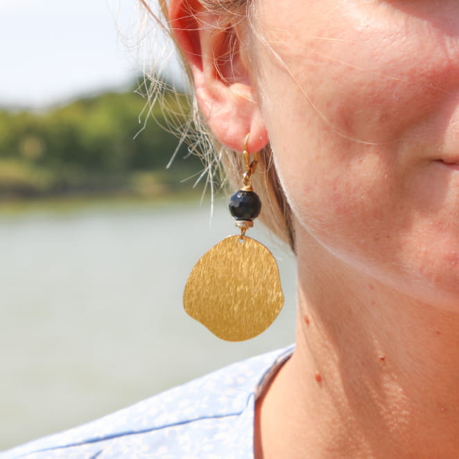 Laissez-vous sublimer par les boucles d'oreilles Dores. Ces boucles d'oreilles fantaisie d'une élégance minimaliste, arborent un pendentif ovale destructuré doré, une perle en agate noire, et une délicate rondelle dorée. Ces boucles d'oreilles sont l'accessoire idéal pour rehausser votre tenue en toute subtilité.