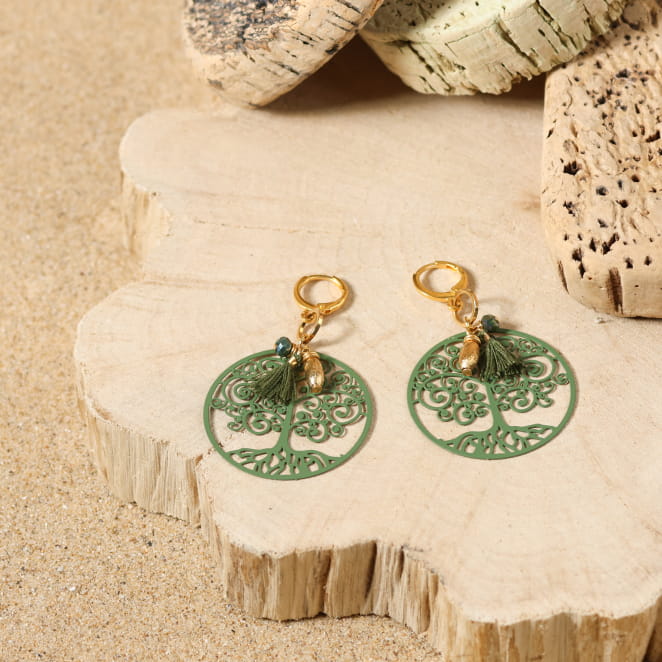 - d'un pendentif en forme d'arbre de vie en métal peint kaki : un symbole intemporel de force et d’épanouissement,