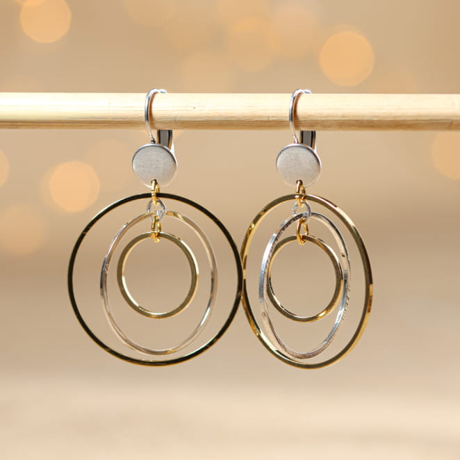 Offrez-vous un jeu de cercles lumineux avec nos boucles bicolores, Electron. Tout en mouvement et en équilibre, ces boucles d’oreilles mêlent les reflets chauds et froids : un grand cercle doré, un plus petit argenté, puis un mini anneau doré en cascade. Les anneaux dansent doucement au rythme de vos gestes, pour une allure graphique, féminine et résolument contemporaine.