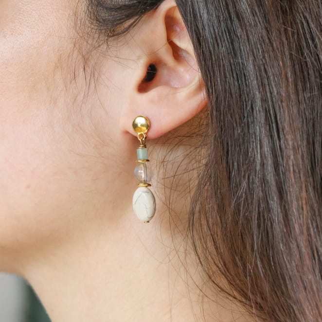 Découvrez les boucles d’oreilles Elvyra, une touche d’évasion et de douceur inspirée des bords de mer. Leurs teintes beige et doré, associées à des perles soigneusement choisies, rappellent la lumière de l’Île d’Oléron et l’authenticité des bijoux faits main. Un accessoire lumineux pour sublimer vos moments avec simplicité.