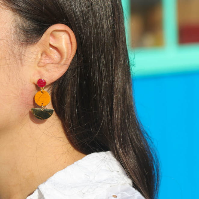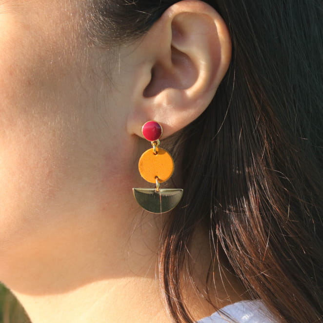 Affirmez votre style avec les boucles d'oreilles Encre. Ces créations dorées suspendent trois pendentifs, et offrent une harmonie parfaite entre élégance et originalité. Arborant un rond doré et rouge, un rond en cuir couleur moutarde, ainsi qu'un demi-disque en métal doré, ces boucles apportent une touche de classe à chaque tenue. Soyez chic en toute occasion avec ces bijoux uniques qui ajoutent une note distinctive à votre look.
