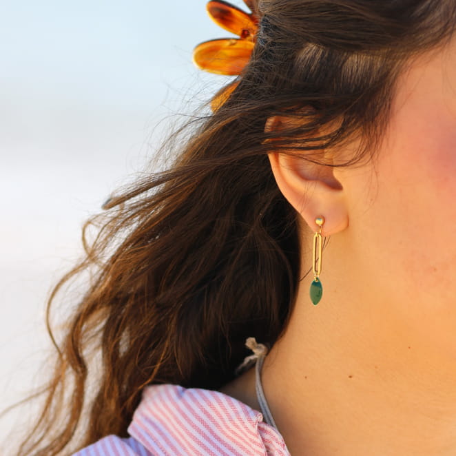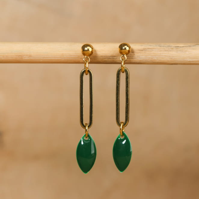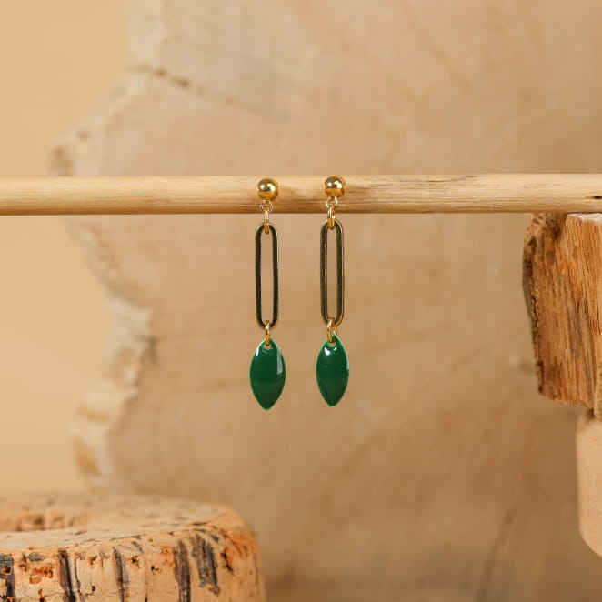 Apportez une note raffinée et originale à votre style avec les boucles d’oreilles Épine. À la fois discrètes et audacieuses, elles associent avec harmonie un clou d’oreille doré, un maillon de chaîne délicatement travaillé et une goutte en résine vert sapin. Leur design minimaliste, rehaussé par la profondeur du vert et l’éclat doré, fait de ces boucles un bijou facile à porter au quotidien. Leur légèreté les rend particulièrement agréables à porter, tout en apportant une touche d’originalité subtile et distinguée.