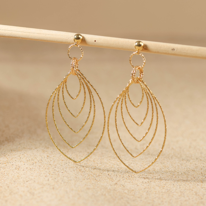 Découvrez nos boucles d’oreilles Esmeralda, une création lumineuse et légère qui apporte une touche d’éclat à votre style. Ces boucles d’oreilles, composées de pendentifs en forme de gouttes et d’anneaux ronds dorés, captent la lumière pour un effet brillant et naturel. Ce bijou est parfait pour sublimer votre look !