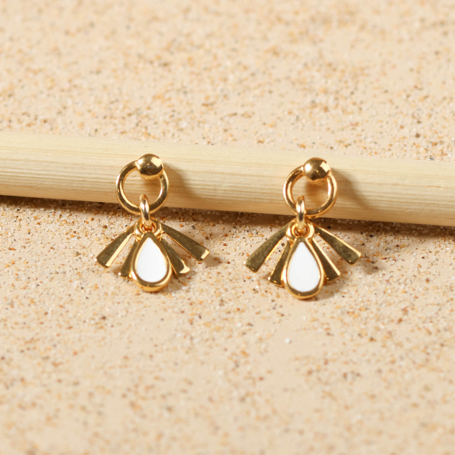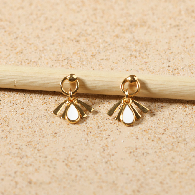 Découvrez ces petites boucles d'oreilles pour femme, Esprit qui allient douceur et luminosité, inspirées par l’esprit nature et la plage. Leurs mini anneaux ronds, pendentifs gouttes et triangles en métal doré à l'or fin 24K, sublimés par une touche d’émaille blanc, évoquent l’évasion et le fait main.