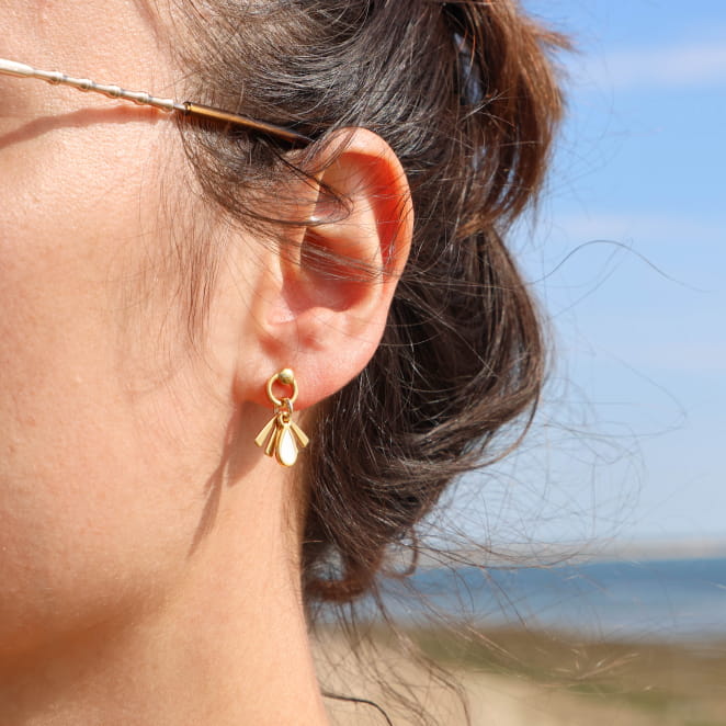 Découvrez ces petites boucles d'oreilles pour femme, Esprit qui allient douceur et luminosité, inspirées par l’esprit nature et la plage. Leurs mini anneaux ronds, pendentifs gouttes et triangles en métal doré à l'or fin 24K, sublimés par une touche d’émaille blanc, évoquent l’évasion et le fait main.