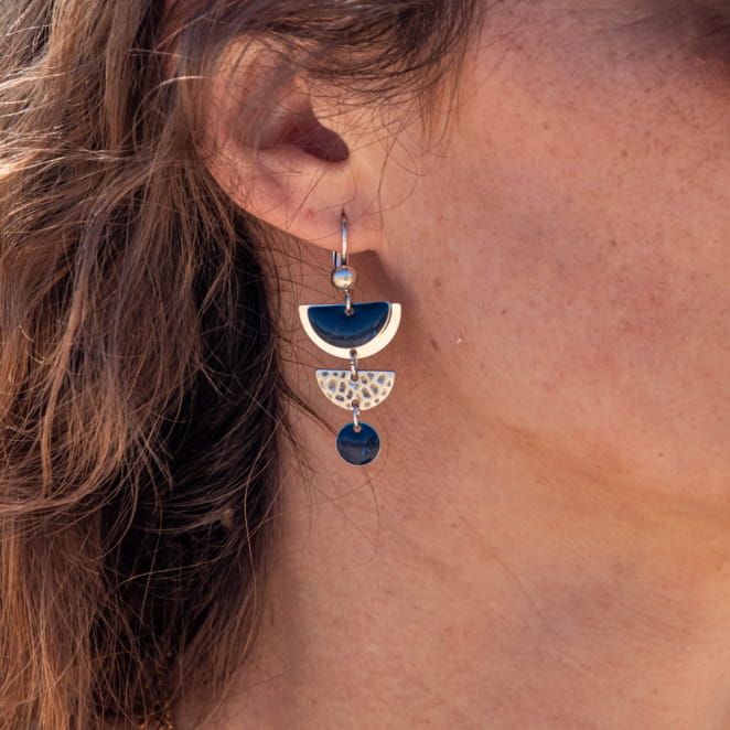 Les boucles d'oreilles Eve incarnent l'élégance contemporaine avec leurs pendentifs demi-disques en métal argenté et émail bleu vif. Légères et faciles à porter, elles captivent par leur raffinement. Ces bijoux polyvalents s'adaptent à tous les styles, répondant parfaitement aux désirs de chacun. Un accessoire qui allie à merveille la praticité et l'élégance pour sublimer toute tenue avec panache.