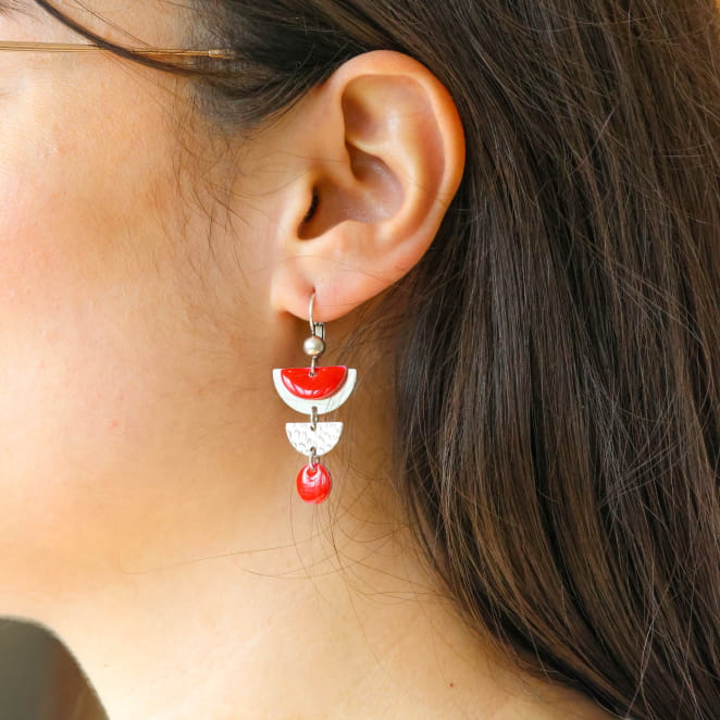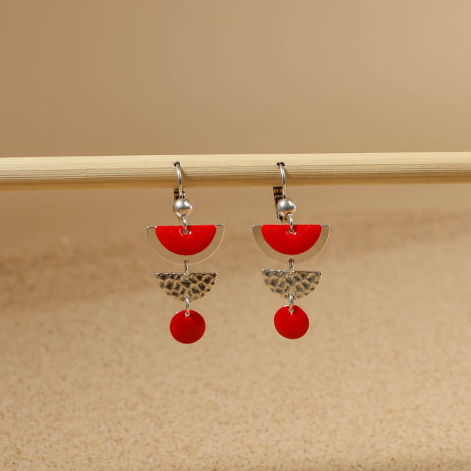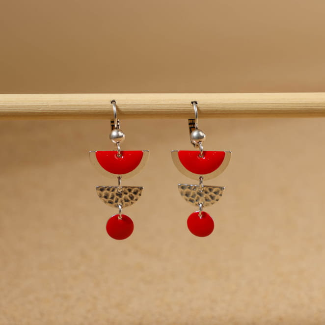 Les boucles d'oreilles Eve incarnent l'élégance contemporaine avec leurs pendentifs demi-disques en métal argenté et émail rouge vif. Légères et faciles à porter, elles captivent par leur raffinement. Ces bijoux polyvalents s'adaptent à tous les styles, répondant parfaitement aux désirs de chacun. Un accessoire qui allie à merveille la praticité et l'élégance pour sublimer toute tenue avec panache.