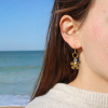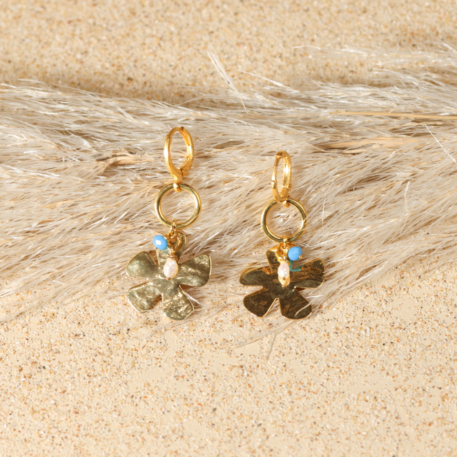 Découvrez nos boucles d'oreilles pour femme Fleurette, une création délicate et lumineuse qui capture l’essence des vacances et l’esprit nature. Ces boucles d'oreilles pour femme associent des perles en verre bleu, des perles de rivière blanches, et un pendentif en forme de fleur dorée, le tout monté sur des dormeuses dorées. Un bijou fait main qui apporte une touche d’évasion et de douceur à votre style, inspiré par le bord de mer.