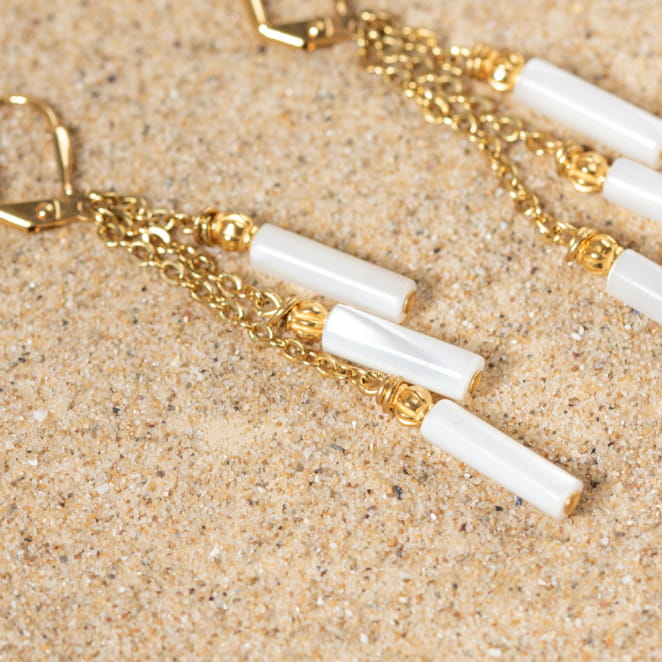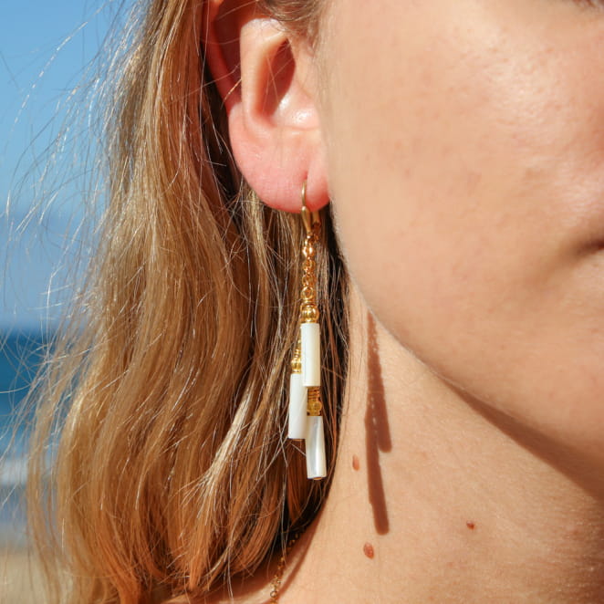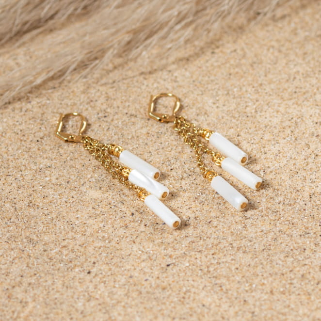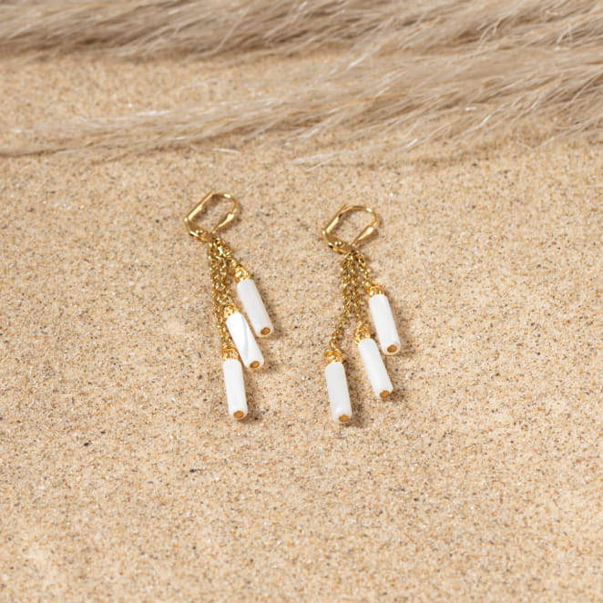 Les boucles d'oreilles Florence, élégantes et raffinées, combinent des filaments dorés avec des perles tubes en nacre blanche. voir plus