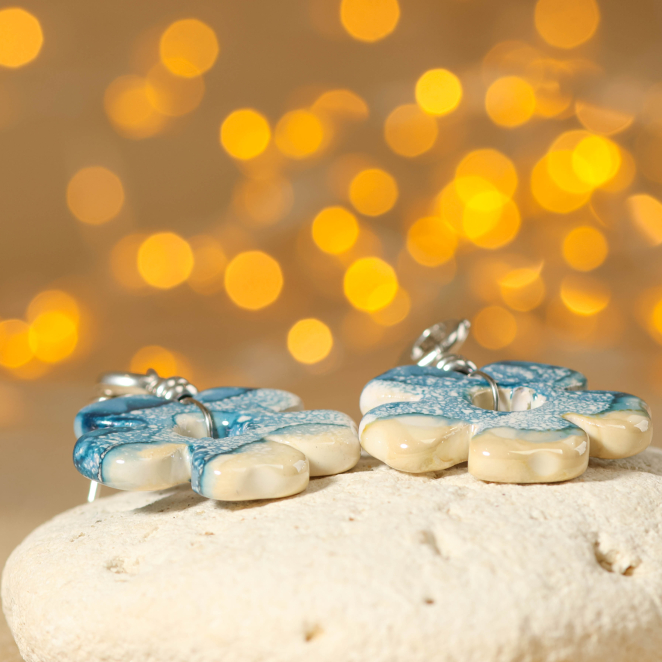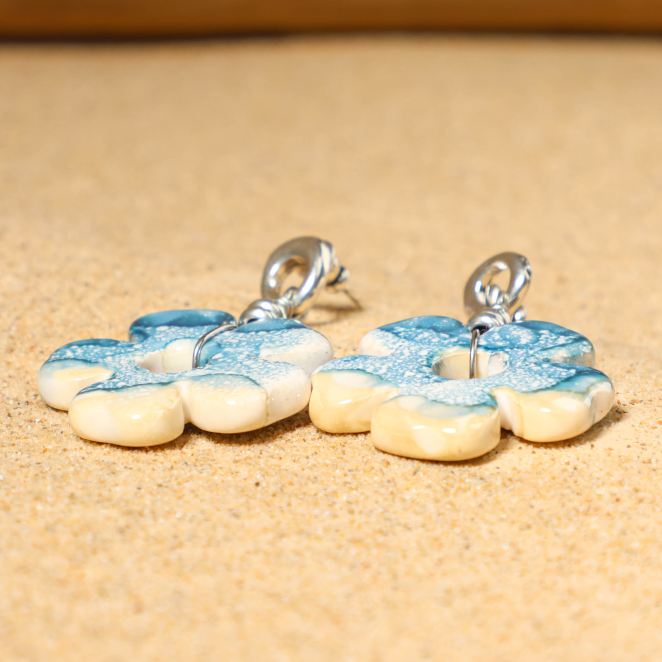 Apportez une touche florale à vos oreilles avec les boucles d'oreilles pour femme Flores. Ces pièces sont originales par ces fleurs en céramiques bleues, ces délicates boucles évoquent les teintes douces du sable se mêlant à l'océan. Ces bijoux pour femme en céramique combinent de l'argenté apportant éclat à votre visage, ces boucles d'oreilles sont des pièces uniques à ajouter à votre tenue !