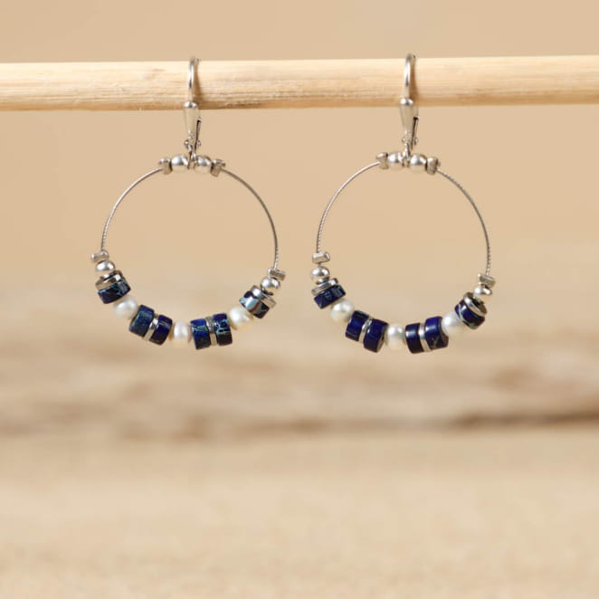 Laissez-vous séduire par les boucles d'oreilles Forio, une fusion élégante de textures. Son câble en acier argenté accueille des perles bleu marine, des perles de rivières blanches et des perles plates argentées, créant un équilibre subtil entre sophistication et décontraction.