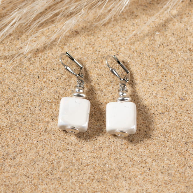 Ajoutez une touche de fraîcheur à votre style avec les boucles d'oreilles Gel. Ces jolies pendantes combinent des perles céramiques blanches carrées et du métal argenté pour un look élégant et éclatant. Leur design simple et raffiné s'accorde avec n'importe quelle tenue, vous assurant une allure chic et polyvalente en toute occasion.