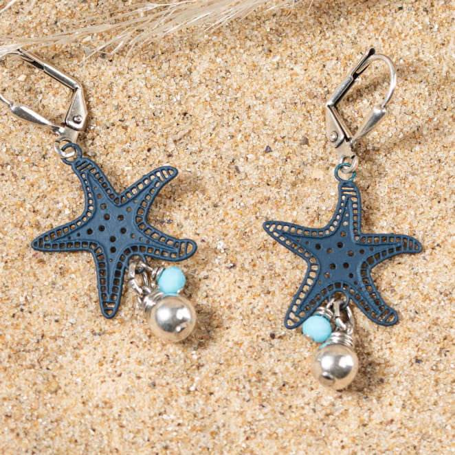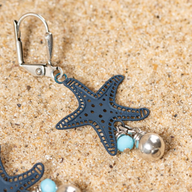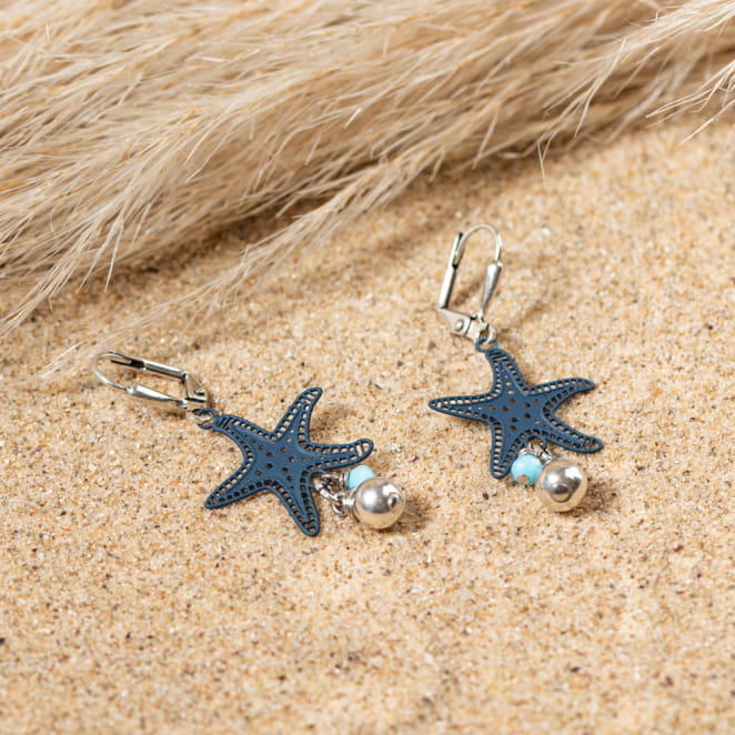 Optez pour l'audace avec les boucles d'oreilles fantaisies Grenettes. Ornées de pendentifs étoiles de mer en métal bleu, elles captivent avec des perles assorties en bleu et en métal argenté. Un choix original pour sublimer votre style marin avec éclat.