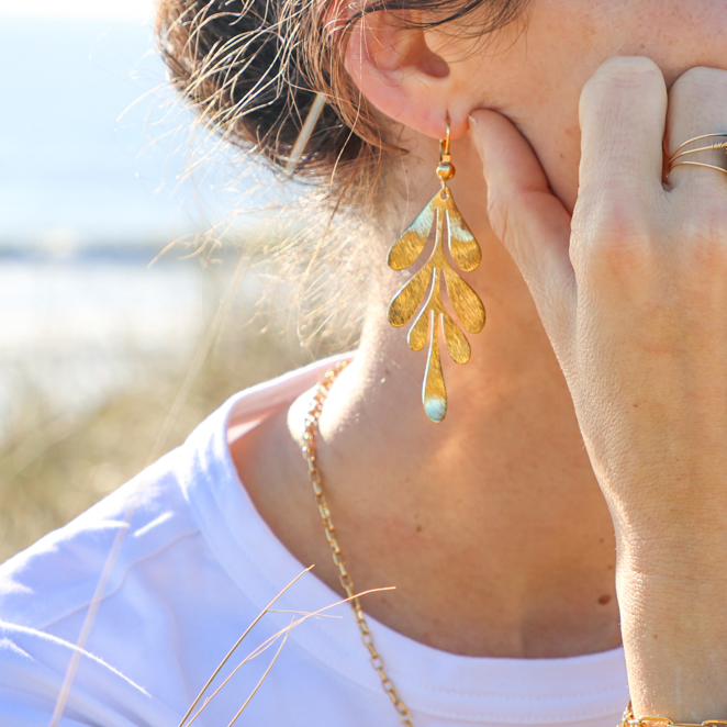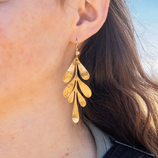 Les boucles d'oreilles Gui, délicatement conçues en métal doré, captivent par leur originalité et leur élégance. Leur design en forme de feuilles exprime un charme naturel et sophistiqué. En dépit de leur volume, ces boucles restent remarquablement légères, assurant un confort absolu lorsqu'elles sont portées. Un accessoire raffiné et plein de style pour sublimer toute tenue avec grâce.