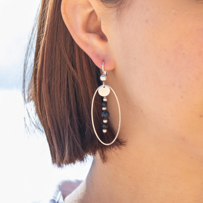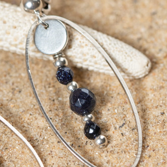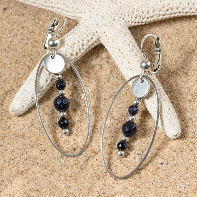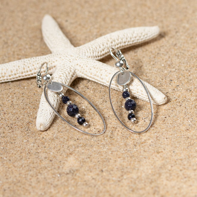 Sublimez votre allure avec les boucles d'oreilles . Hermine : leurs anneaux ovales argentés entourent une cascade de perles en pierre de sable bleu marine et en métal argenté. Un mariage de matières et de couleurs qui ajoute une touche sophistiquée à n'importe quelle tenue, pour un style résolument chic et tendance.