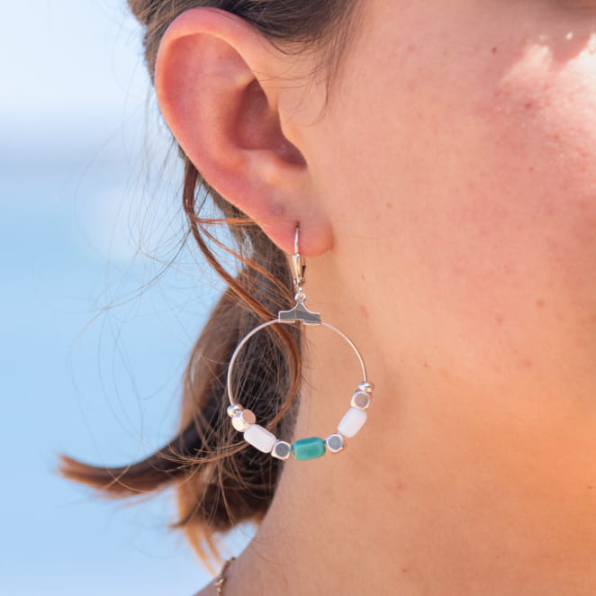 Laissez-vous séduire par l'élégance polyvalente des boucles d'oreilles Hossegor. Ces créoles argentées sont ornées de perles tubes en verre aux tons blanc et turquoise, offrant un éclat subtil et une touche de couleur. Parfaites pour toutes les occasions, elles ajoutent une note raffinée à votre style, que ce soit en journée ou en soirée.