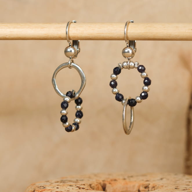 Laissez-vous séduire par le design asymétrique des boucles d’oreilles Isalie argenté et bleu. Inspirées par les reflets scintillants des vagues, elles jouent avec les textures et les contrastes pour un rendu à la fois moderne et raffiné. Chaque boucle révèle une composition unique : sur l’une, un cercle argenté enlace un anneau de perles bleues et argentées, tandis que sur l’autre, l’ordre s’inverse, crée un équilibre subtil et captivant. Les perles bleu marine en pierre de sable apportent une touche finale, rappelant la profondeur des océans !