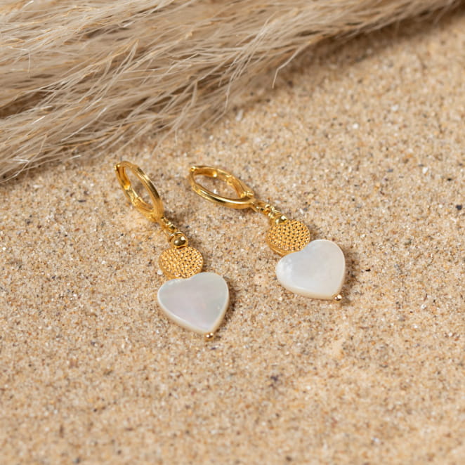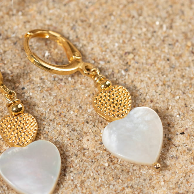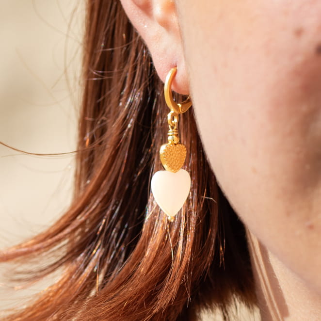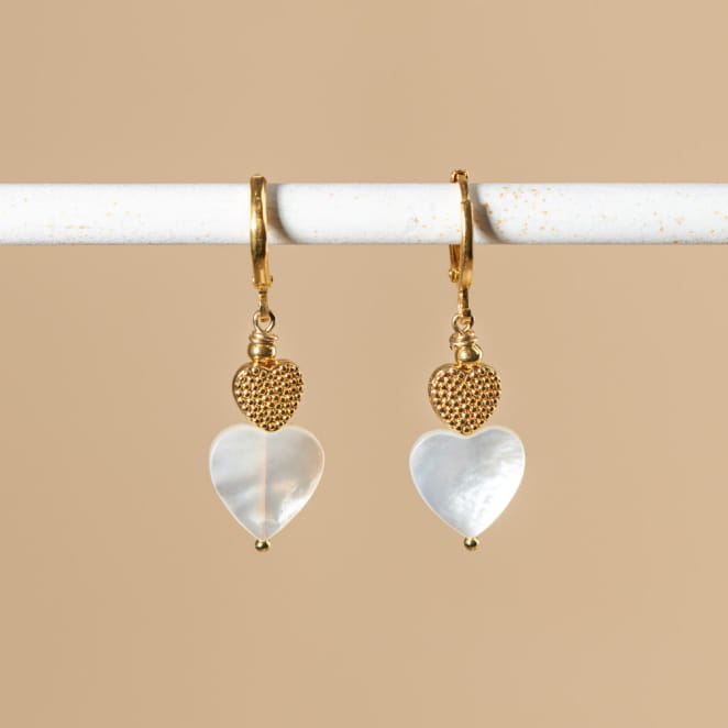 Découvrez les boucles d'oreilles Iseult, l'accessoire idéal pour les passionnés de romance. Ornées d'un pendentif doré et d'une perle en nacre blanche, tous deux en forme de cœur, elles capturent l'esprit de l'amour. Avec leur élégance subtile, ces boucles d'oreilles ajoutent une touche de romantisme à toute tenue. Un choix parfait pour exprimer votre amour.