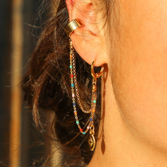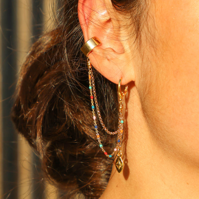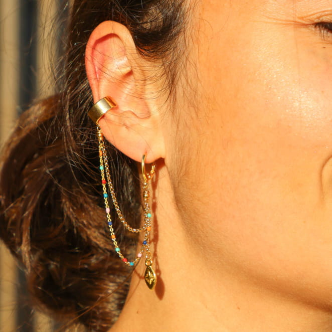 Affirmez votre style avec Janeiro, une boucle d’oreille earcuff unique et originale ! Cette création associe une boucle dorée classique, à porter dans un lobe percé, et un earcuff relié par une chaîne fine et délicate. Pas besoin de deuxième trou : l’earcuff se fixe grâce à une bague ajustable, créant l’effet d’un faux piercing élégant et tendance ! Légère et confortable, cette boucle joue sur l’équilibre parfait entre audace et sophistication. Des touches de couleurs viennent égayer l’ensemble, ajoutant une note bohème et artistique à ce bijou captivant. Fabriquée à la main en France, cette boucle est idéale pour celles qui aiment se démarquer, avec des pièces artisanales et uniques. Sa conception ingénieuse permet de la porter facilement tout au long de la journée, grâce à son design original ! Adoptez une pièce pleine de caractère et de modernité, où chaque détail raconte une histoire d’artisanat et de créativité.