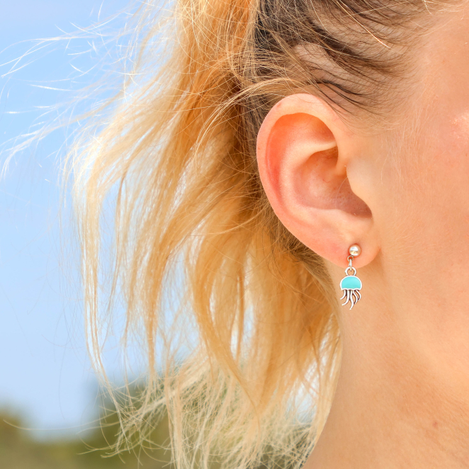 Découvrez ces petites boucles d'oreilles Jellyfish, une création délicate inspirée par l'océan et l’esprit lumineux du bord de mer. Ces boucles d'oreilles pour femme, avec leur pendentif émaillé bleu en forme de méduse, apportent une touche d’évasion et de douceur à votre style. Fabriquées dans nos ateliers, elles capturent l’essence des vacances et de la nature, idéales pour celles qui aiment les accessoires uniques et artisanaux.