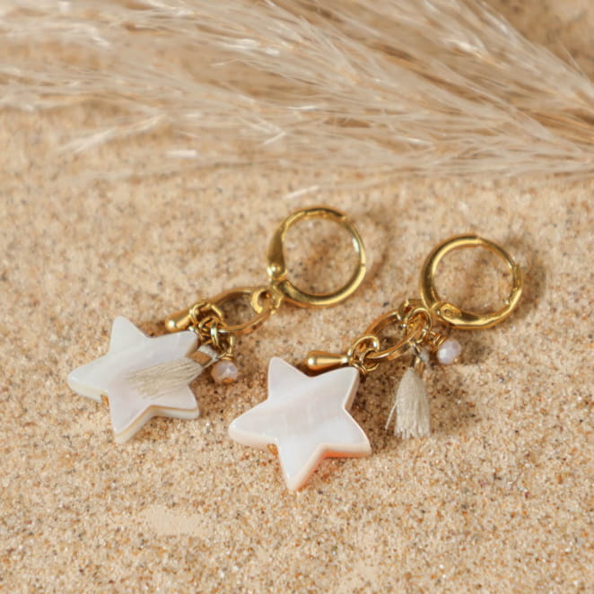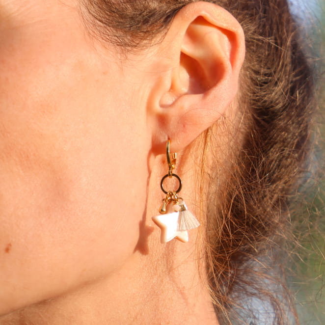 Affirmez votre style avec cette paire de boucles d'oreilles Jersey, idéale pour apporter une touche de fantaisie et de lumière à toutes vos tenues. Ces boucles d'oreilles en métal doré à l'or fin, ornées d'un pendentif en forme d'étoile blanche et d'un petit pompon délicat, allient charme et légèreté. Inspirées par les nuits étoilées, elles capturent une esthétique douce et poétique qui ne manquera pas de séduire ! Faciles à porter, elles sont légères et confortables, idéales pour celles qui recherchent un bijou à la fois tendance et intemporel.