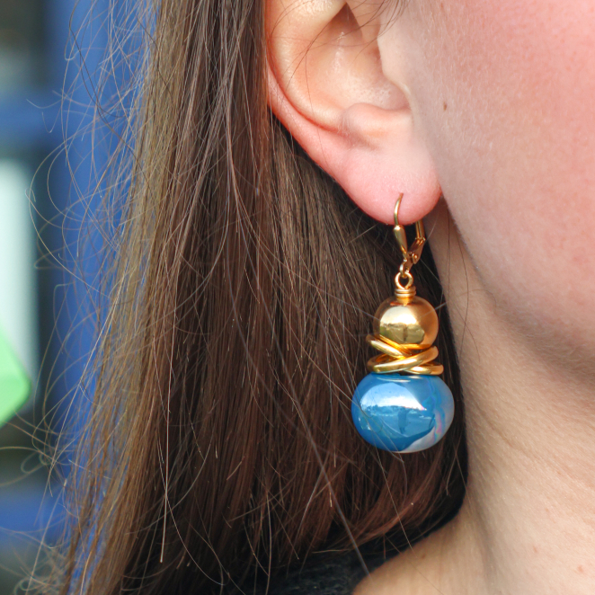 Offrez à votre tenue une touche marine avec ces jolies boucles d'oreilles Jeux en souvenir de vos vacances à la mer. Ses boules en céramique bleue, vous apporteront de la fantaisie...tout en douceur !