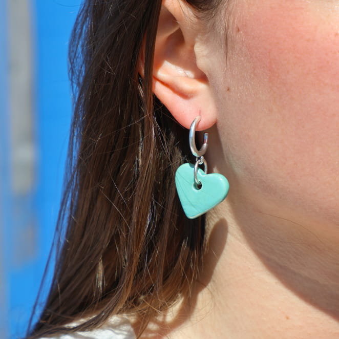 Retrouvez la douceur avec ces boucles d’oreilles pour femme, où un pendentif cœur en céramique émeraude se marie à un anneau et un clou argentés. Inspiré par la simplicité et la lumière des bords de mer, ce bijou apporte une touche de poésie à votre look. Disponible en rouge et blanc pour s’adapter à toutes vos envies.