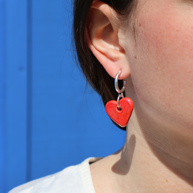 Retrouvez la douceur avec ces boucles d’oreilles pour femme, où un pendentif cœur en céramique rouge se marie à un anneau et un clou argentés. Inspiré par la simplicité et la lumière des bords de mer, ce bijou apporte une touche de poésie à votre look. Disponible en émeraude et blanc pour s’adapter à toutes vos envies.