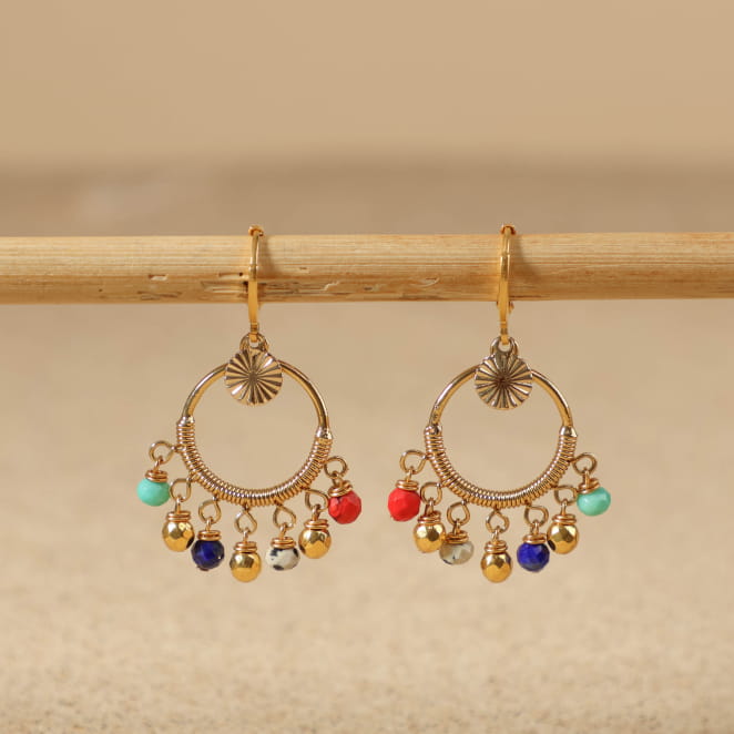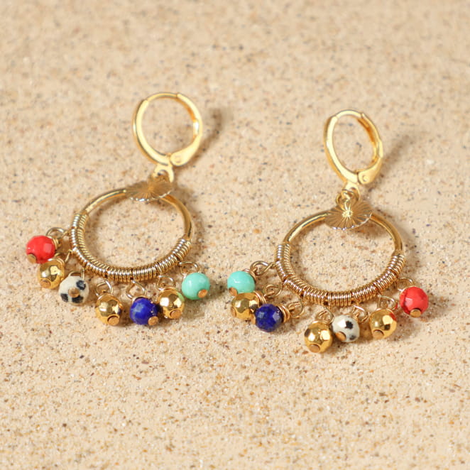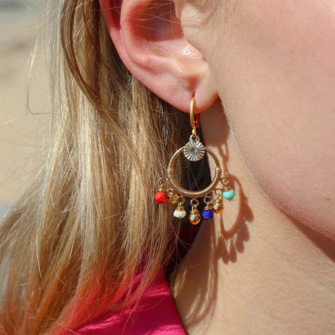 Égayez vos tenues avec les boucles d'oreilles Joye, ces bijoux apportent une touche vibrante à votre tenue grâce à ces perles multicolores. Un bijou fantaisie alliant chic et originalité en mêlant doré et couleurs variées. Ces pièces charmantes apportent une touche de naturel avec des perles en pierre et de chic avec le pendentif disqué doré. Ces créoles pour femme sont légères et tendances.