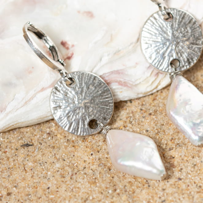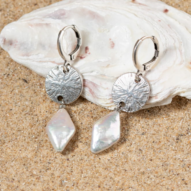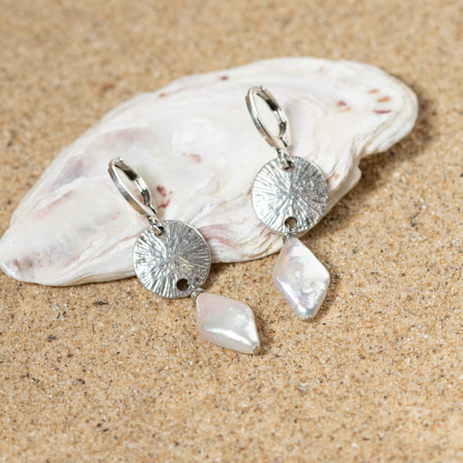 Sublimez votre look avec les boucles d'oreilles Juline : leur pendentif rond argenté soutient une superbe perle de rivière blanche en forme de losange, offrant éclat et lumière à votre visage. voir plus