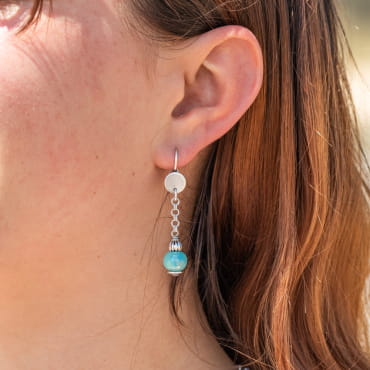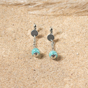 Les boucles d'oreilles Justine, ornées d'une perle en verre émeraude et d'une perle délicatement argentée, apportent une touche de fraîcheur à votre style. La perle émeraude, profonde et lumineuse, évoque les eaux de l'océan, tandis que la perle argentée ajoute une note de raffinement discrète. Légères et élégantes, elles captent la lumière avec délicatesse, parfaites pour rappeler les éclats de la mer même loin des plages.