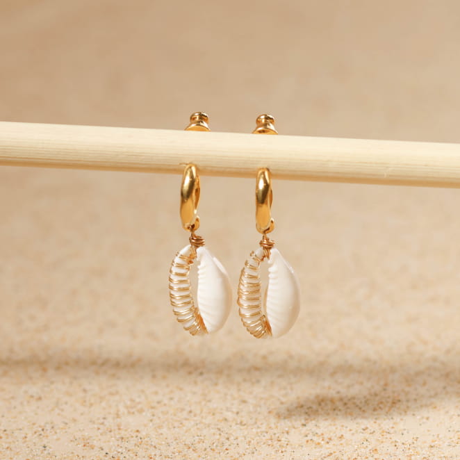 Retrouvez l’esprit des vacances au bord de mer avec cette paire de boucles d'oreilles Kamala, où le blanc pur du coquillage cauri se marie au doré éclatant. Ce bijou artisanal évoque le sable chaud et le soleil, pour un style lumineux et naturel. Laissez-vous porter par son charme apaisant, inspiré des paysages de la côte Ouest.