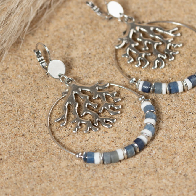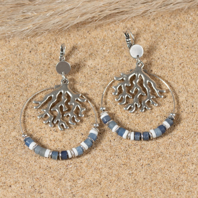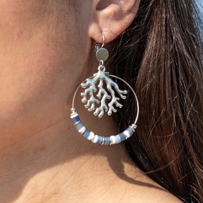 Découvrez l'élégance marine avec les boucles d'oreilles Karina. Des créoles argentées accueillent des perles bleues marines en sodalite, des perles plates argentées et des disques de coquillages blancs, évoquant la beauté des fonds marins. Un pendentif en corail argenté ajoute une touche raffinée à cette création unique, parfaite pour une allure chic et inspirée par la mer !