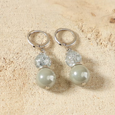 Découvrez ces boucles d’oreilles artisanales pour femme Kenitra, où la lumière danse entre une perle en cristal de roche transparente et une perle en verre. voir plus