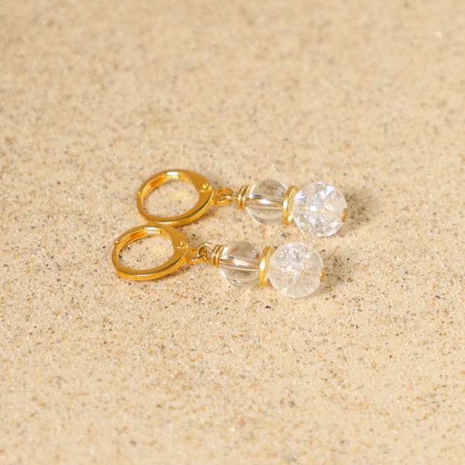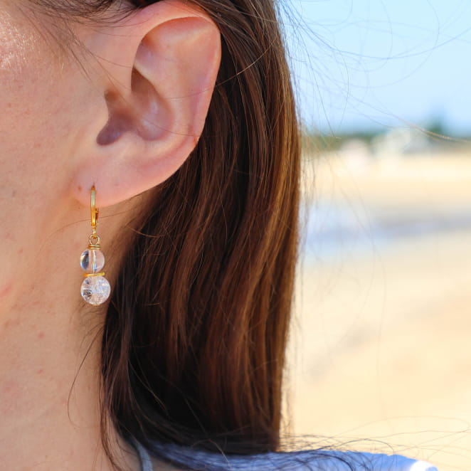 Illuminez votre visage avec les boucles d’oreilles Kenitra, une création délicate et lumineuse. Fines et légères, ces boucles d’oreilles pour femme associent l’éclat du doré à la transparence pure des perles en cristal de roche. Leur design, raffiné capte la lumière avec subtilité et met en valeur vos traits avec élégance. Parfaites pour toutes les occasions, ces boucles artisanales apportent une touche naturelle, que ce soit au quotidien ou pour sublimer une tenue en bord de mer.