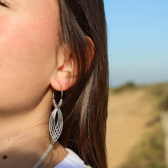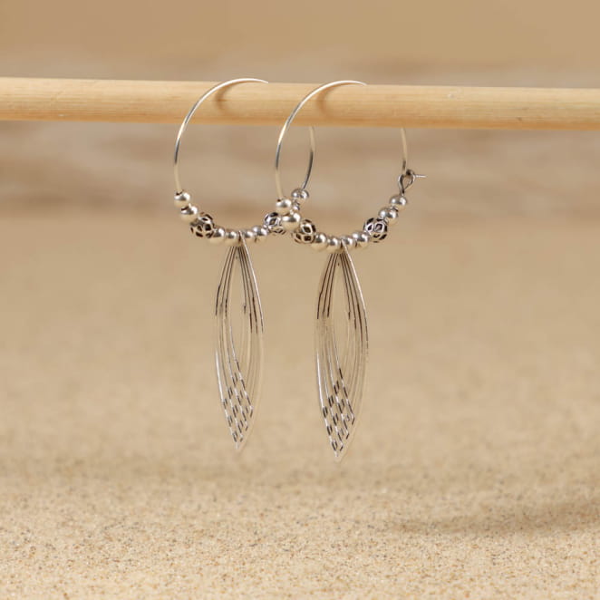 Ajoutez une touche de nature à votre style avec les créoles argentées Leila délicatement ornées. Chaque boucle est agrémentée d'une fine feuille qui danse au gré des mouvements, accompagnée de petites perles argentées qui captent la lumière comme des reflets sur l'eau. Élégantes et légères, ces boucles d'oreilles évoquent la simplicité et la beauté des balades en bord de mer.