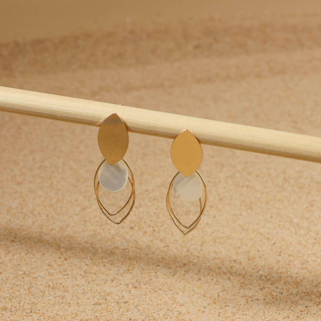Illuminez vos coiffures de ces boucles d'oreilles pendantes Liliane. Légères et élégantes, elles brillent selon la lumière et embellissent tous vos looks. La couleur du métal doré et de la nacre blanche en font un accessoire intemporel.